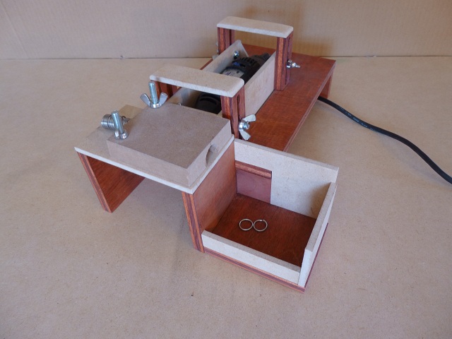 The purpose of the rig is to allow the upward and downward movement/locking of a dremel, so as to accommodate different diameter cutting discs for use in sawing jump rings. Also to allow precise adjustment of the cutting depth.