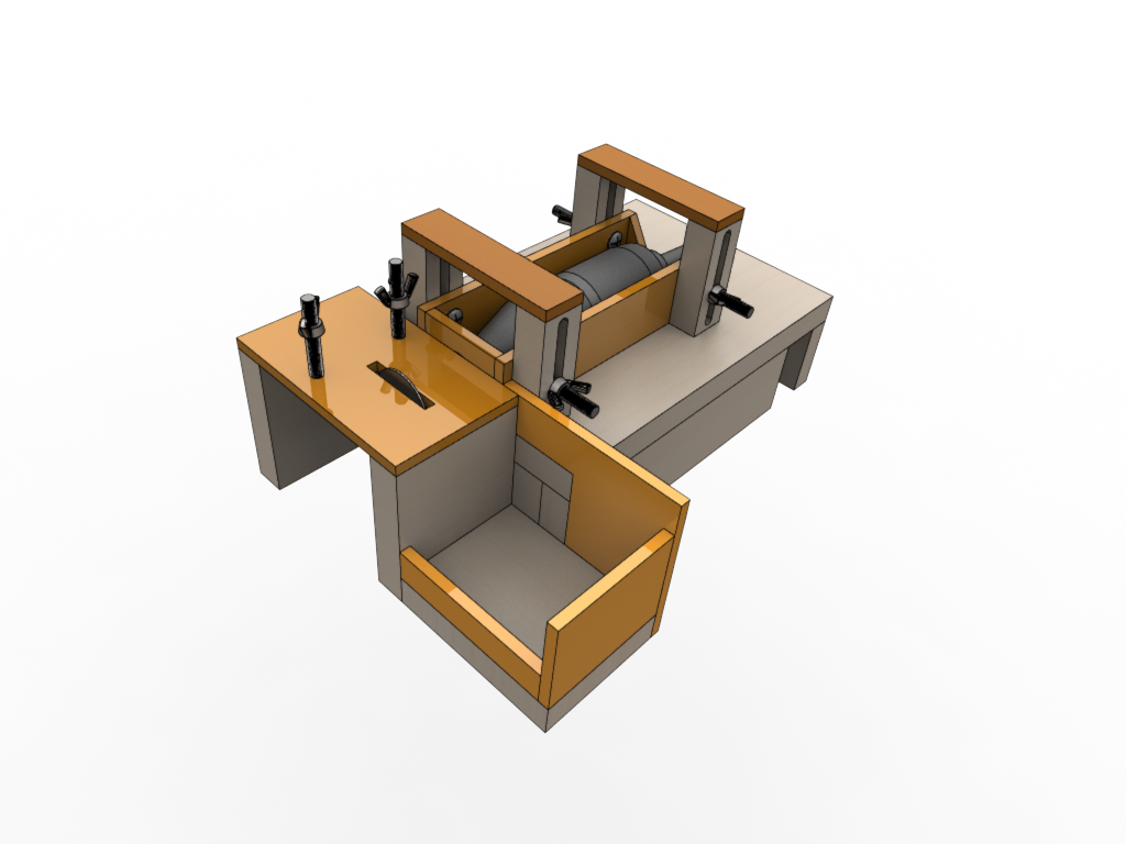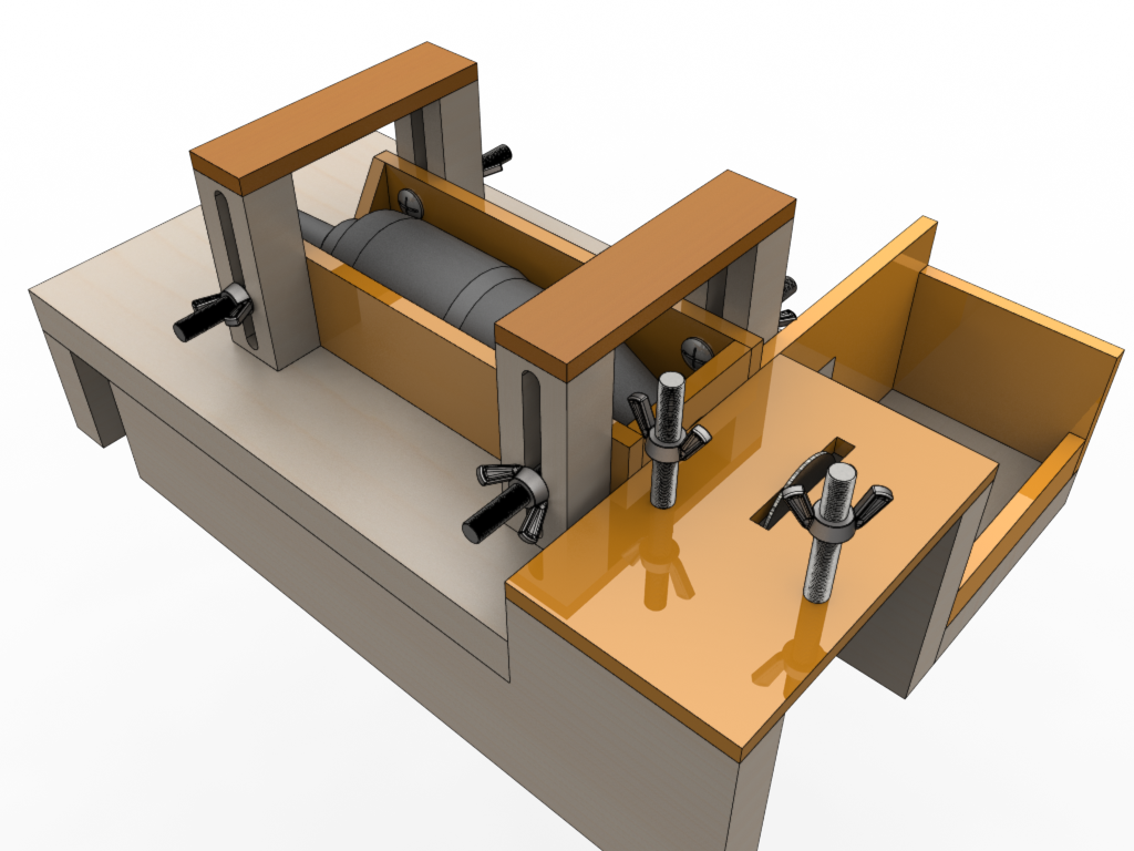 In building the device I have adjusted certain parts of the rig. The model does not yet reflect this. The only major design flaw is that the vibration of the Dremel (M100) causes the ring cutter to travel across the table. I plan to remedy this by either adding tabs to the legs for clamping to the table or adding weights.