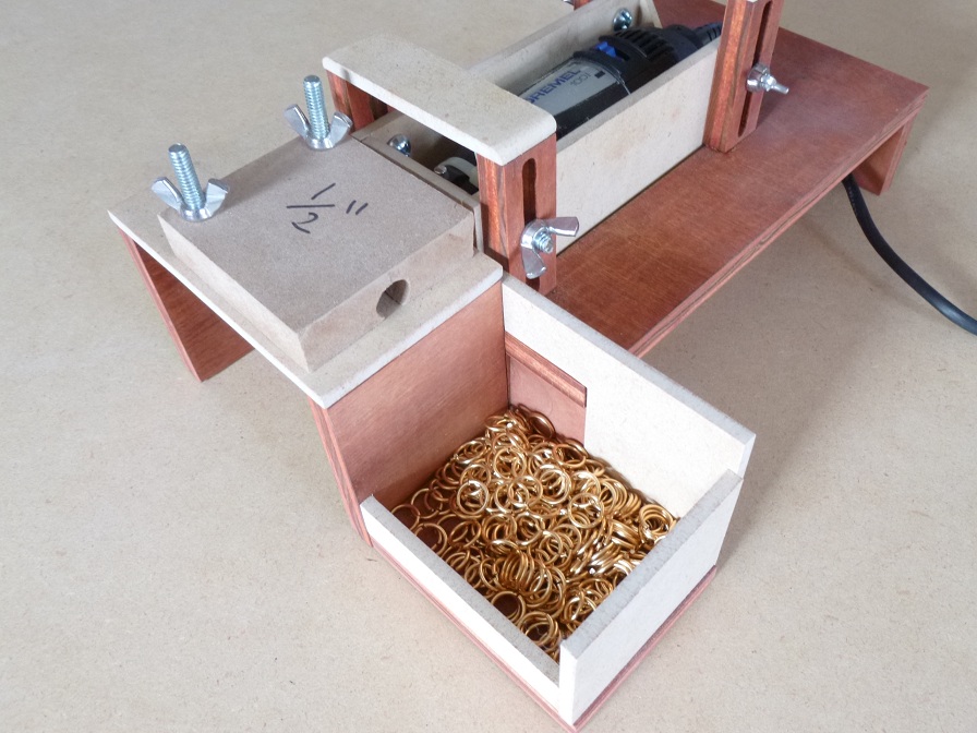 The coil is fed through the guide, and freshly cut jump rings are collected in the small box on the side.